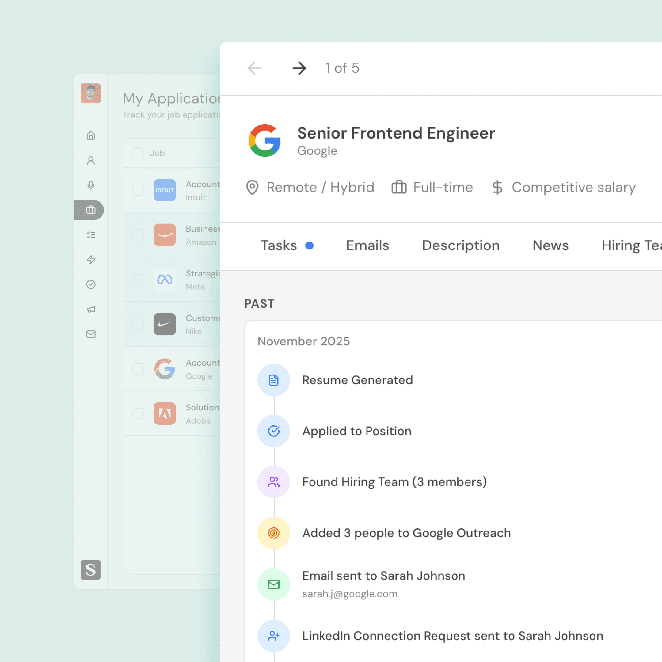 See your applications, outreach, follow ups, and responses in a single dashboard so nothing slips.